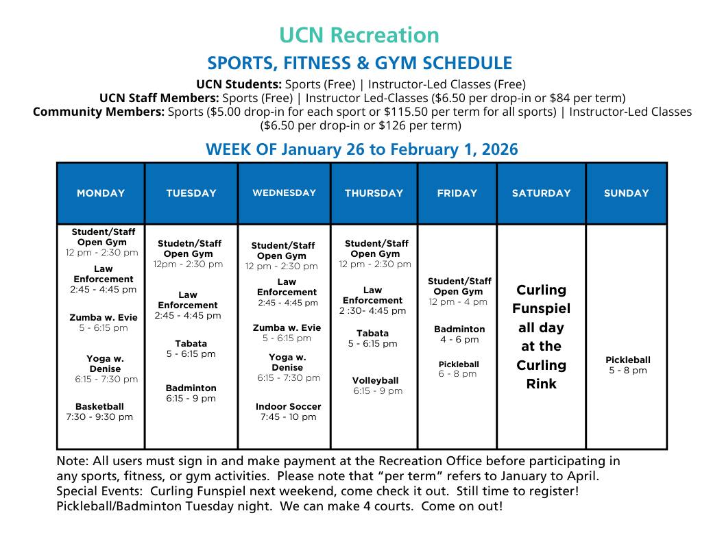 More information, including current and upcoming schedules, can be found on the UCN Student Life at The Pas Campus Facebook page.